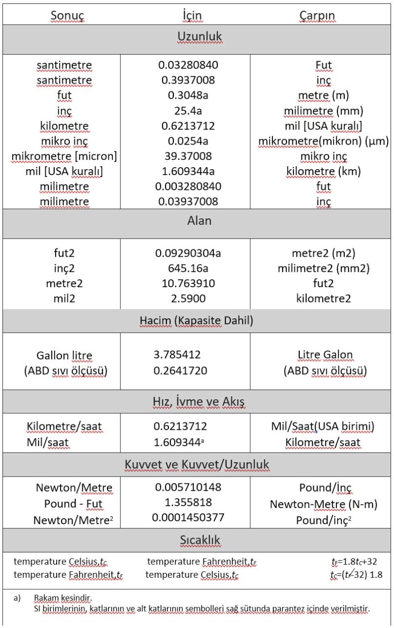 Dönüştürme Tablolarının Kullanımı: Aşağıdaki sayfalarda, geniş bir değer aralığında İngilizce’den metrik birimlere ve tam tersine dönüşüme izin veren tablolar verilmiştir. İstenen değerin bu tablolardan doğrudan elde edilemediği durumlarda, aşağıdaki örneklerde gösterildiği gibi doğrudan tablodan alınan iki veya daha fazla değerin basit bir şekilde eklenmesi yeterli olacaktır: